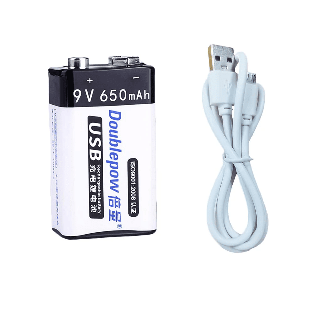 Batería recargable de litio Doublepow de 9V y 650mAh, con cable USB incluido. Ideal para una amplia gama de dispositivos que requieren baterías de 9V, ofreciendo carga rápida, alta capacidad y seguridad en el uso.