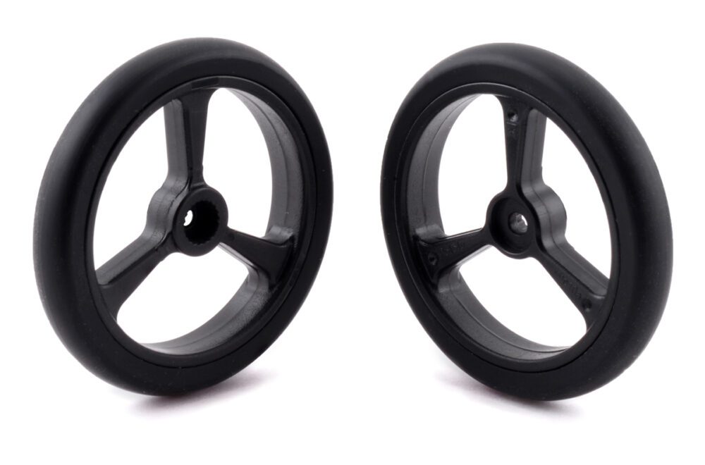 Estas ruedas son ideales para robótica, vehículos RC personalizados o cualquier otro proyecto que necesites para empezar. Miden 40 mm (1,57′′) de diámetro y están diseñados para su uso con micro servos con estrías de 4,8 mm de diámetro con 21 dientes, como los servos de micro rotación continua FS90R de FEETECH y los servos de micro rotación continua digital FT90R. La combinación puede servir como un sistema de accionamiento pequeño, económico y fácil de controlar para un robot en miniatura. La rueda presiona sobre la horca del servo como una bocina de servo típica, y el pequeño tornillo incluido con el paquete de accesorios de servo para montar las bocinas de servo debe usarse para mantener la rueda en su lugar. Los neumáticos de silicona incluidos también están disponibles por separado.