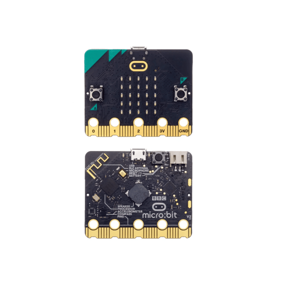 La tarjeta microbit V2 es una pequeña computadora programable diseñada para que aprender y enseñar sea fácil y divertido. Viene equipada con un micrófono y altavoz, sensores capacitivos, de luz y temperatura, un sensor de movimiento de 3 ejes, dos botones configurables, y 19 GPIOs versátiles. Además, incluye una matriz de LEDs 5×5 controlable de forma individual, Bluetooth 5.0 BLE y RF, puerto USB, y un conector para baterías externas.