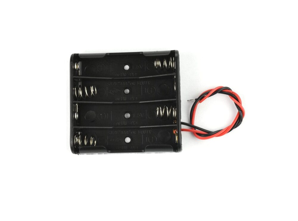 Porta pilas para 4 baterías AA, fabricado en plástico ABS resistente, ideal para conectar baterías en protoboards y circuitos, con conexión en serie y calibre de alambre 22.