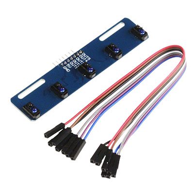 Hay cinco sensores infrarrojos TCRT5000L. Puede detectar líneas negras sobre fondo blanco o blanco sobre fondo negro. El vehículo de seguimiento de línea o el robot de seguimiento de línea es el sensor ideal para sus proyectos.